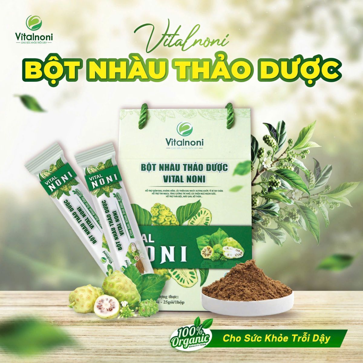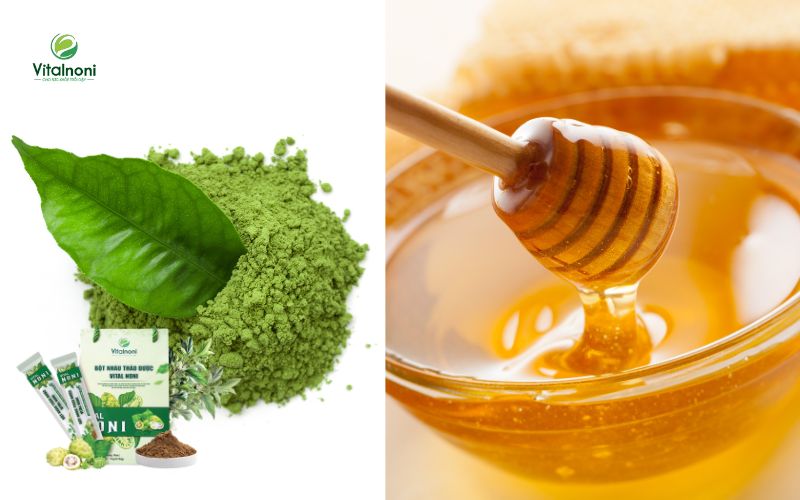 - Nguyên liệu: 1-2 muỗng cà phê bột nhàu thảo dược VitalNoni, 1 muỗng cà phê mật ong nguyên chất.
