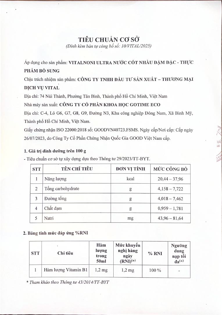 Hồ sơ công bố sản phẩm VITALNONI ULTRA NƯỚC CỐT NHÀU ĐẬM ĐẶC - Trang 2