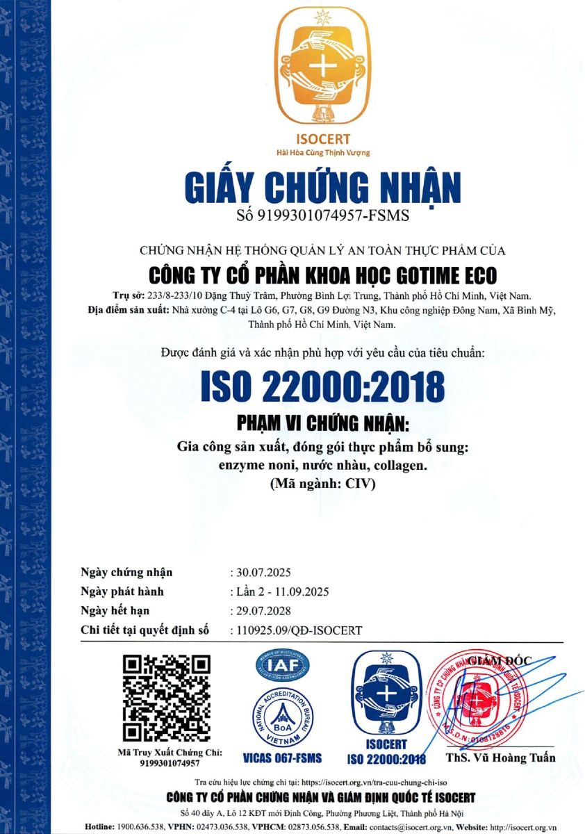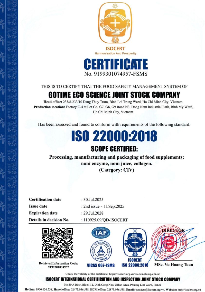 Nhà máy sản xuất nước cốt nhàu Vitalnoni tự hào đạt được chứng nhận ISO 22000:2018, đây là tiêu chuẩn quốc tế về hệ thống quản lý an toàn thực phẩm. Chứng nhận này là minh chứng cho việc chúng tôi áp dụng các nguyên tắc quản lý chất lượng nghiêm ngặt, từ quy trình sản xuất đến khâu đóng gói.