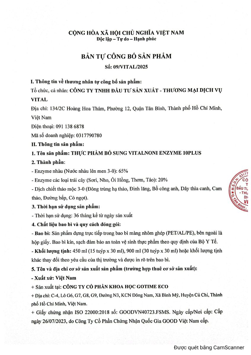 Hồ sơ công bố sản phẩm VITALNONI ENZYME 10PLUS - Trang 2