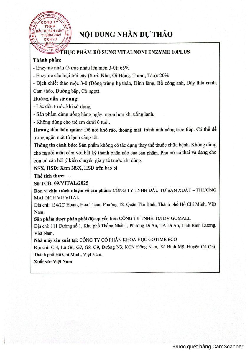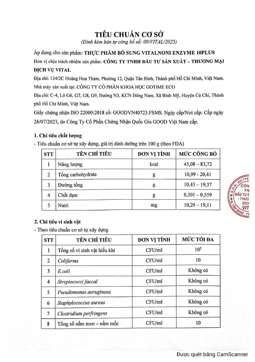Hồ sơ công bố sản phẩm VITALNONI ENZYME 10PLUS - Trang 3
