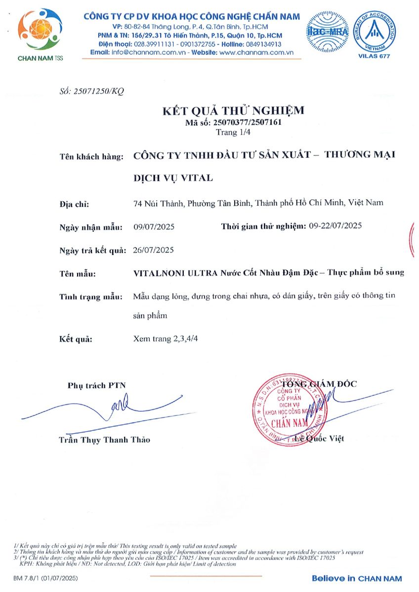 Kết quả kiểm nghiệm VITALNONI ULTRA NƯỚC CỐT NHÀU ĐẬM ĐẶC - Trang 1