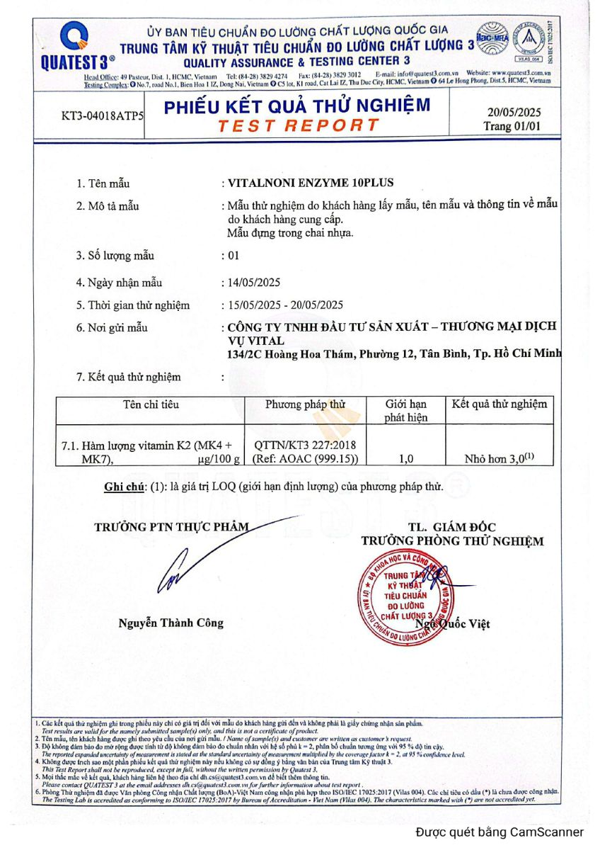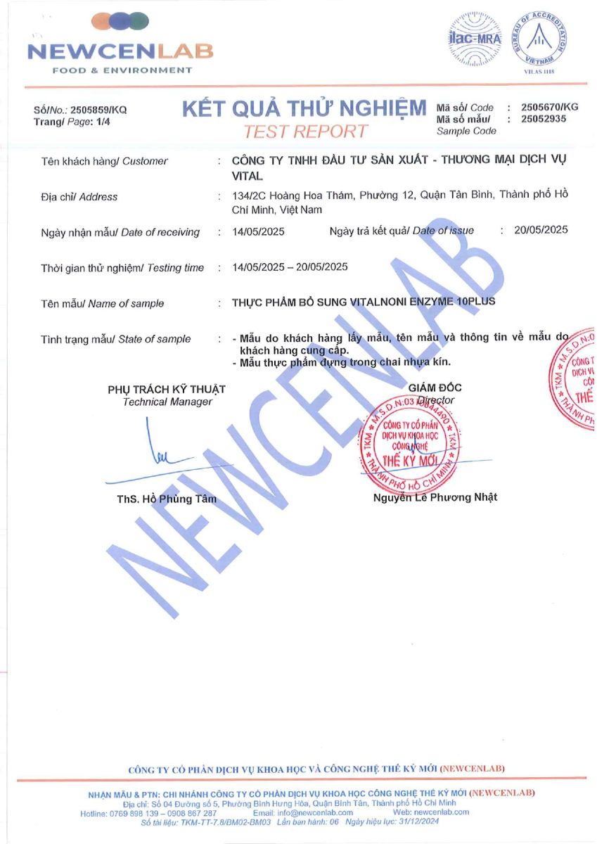 Kết quả thử nghiệm VITALNONI ENZYME 10PLUS - Trang 1