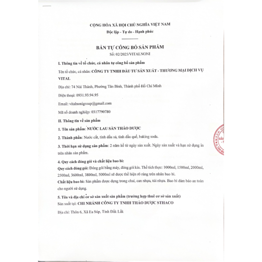 Nước Lau Sàn Thảo Dược VitalNoni là sản phẩm chăm sóc nhà cửa theo hướng tiện lợi và dễ sử dụng mỗi ngày. Sản phẩm kết hợp nước cất cùng tinh dầu sả, tinh dầu quế và baking soda, phù hợp cho nhu cầu lau sàn, làm sạch bề mặt và mang lại cảm giác thơm sạch, dễ chịu hơn cho không gian sống.