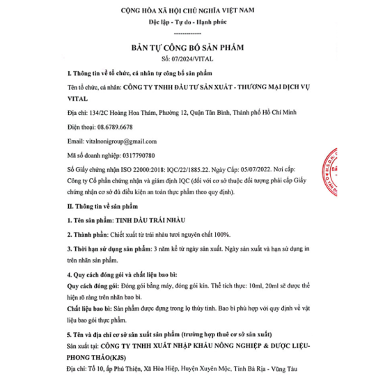 Tinh Dầu Nhàu VitalNoni là sản phẩm được chiết xuất từ 100% trái nhàu khô hữu cơ được chọn lọc từ những trái nhàu chín, ứng dụng công nghệ CO2 siêu tới hạn. Sản phẩm phù hợp cho người muốn lựa chọn tinh dầu nhàu thiên nhiên để chăm sóc da và sử dụng trong thói quen chăm sóc cá nhân hằng ngày.